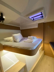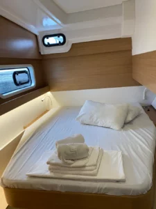 Maksymalna ilość osób jaką Wiseas może pomieścić to 12 – w 2 kabinach dwuosobowych, w 2 kabinach trzyosobowych oraz w salonie, gdzie znajdują się 2 dodatkowe miejsca na spanie. Poduszki i koce są dostępne podczas wynajmu jachtu.